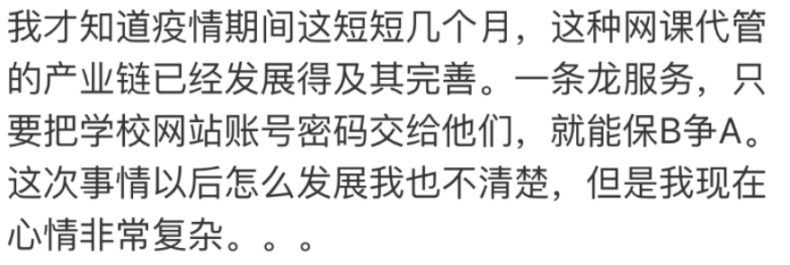 这名老师表示,当初在收到学生作业的时候,心里有已经明白大概是怎么回事,只是她没想到在疫情短短几个月时间里,“网课代管”产业就已经升级地如此迅速…