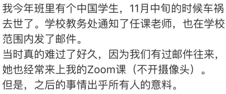 最近一名老师发帖称,自己今年班上有个中国学生11月中旬的时候不幸因为车祸去世了。学校教务处通知了任课老师,也在学校范围内发了邮件。