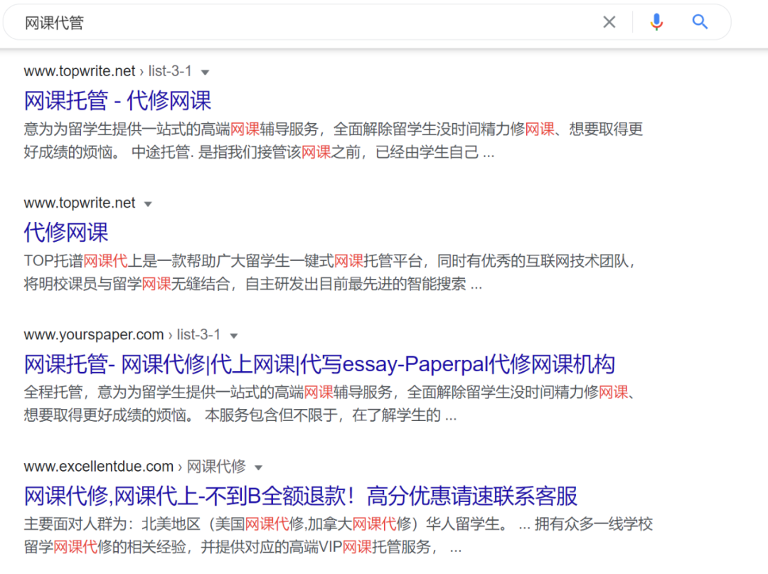 现在随便在搜索引擎里搜索“网课代管”,就会明晃晃地跳出各种广告。