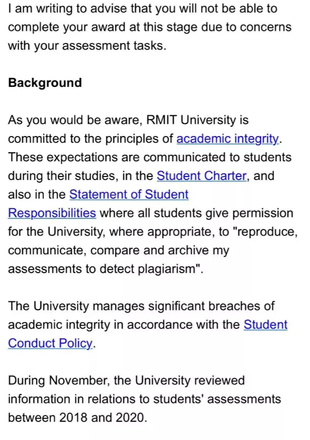 邮件上指出,RMIT在11月重新审查了学生在2018年至2020年提交的所有作业以及测验情况。